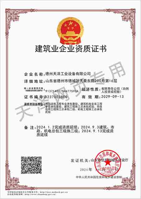 德州天澤工業設備有限公司成立于2003年(前身為德州天元集團天明工業設備安裝公司),經過20多年的發展,現成長為擁有職工600余人,各類專業技術人員近300余人,年生產能力兩億元以上,以建筑機電安裝工程、消防設施安裝工程施工為主,集建筑工程施工、市政工程施工、建筑智能化工程施工、園林綠化工程施工、工程管理服務、物業管理、電氣機械設備銷售等多元化經營于一體的綜合型企業。2005年,企業按照國際標準建立的質量管理體系,通過了ISO質量管理體系認證、環境管理體系認證、職業健康安全管理體系認證。施工工程遍布山東、河北、四川、江蘇等地,最具代表性的工程有:山東省德州市百腦匯資訊廣場機電安裝工程、德州經濟開發區天元大廈機電安裝工程、陵城區人民醫院機電安裝工程、德州金魯班大廈機電安裝工程、河北故城金辰小區機電安裝工程、北川地震災后援建工程等。多年來,公司始終堅持“以人為本,建精品工程,創行業品牌”的經營理念,先后榮獲。ㄊ校┘壧┥奖、天府杯、魯安杯等獎項,申報各種功法、多項專利。